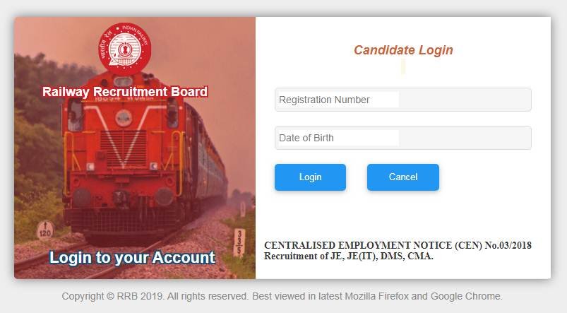 रेलवे भर्ती बोर्ड ने जूनियर इंजीनियर भर्ती के तहत डॉक्यूमेंट वेरिफिकेशन के लिए एडमिट कार्ड जारी कर दिए हैं। उम्मीदवार आधिकारिक वेबसाइट rrbonlinereg.in पर जाकर अपने रजिस्ट्रेशन नंबर और डेट ऑफ बर्थ की मदद से लॉगिन कर अपना एडमिट कार्ड डाउनलोड कर सकते हैं।