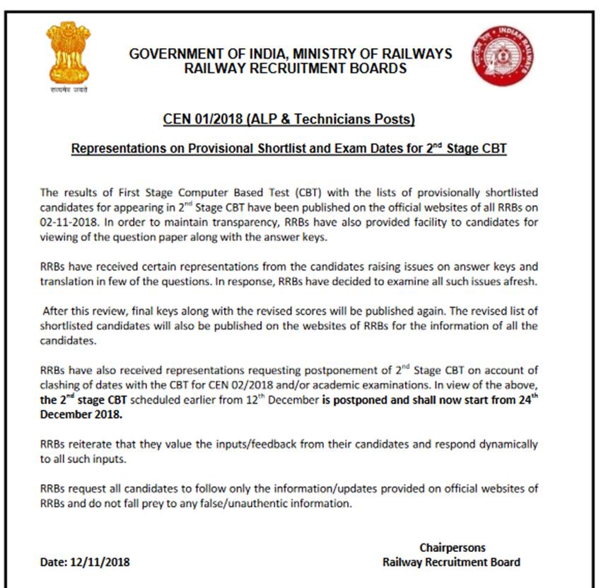 RRB Railway ALP 2nd Stage Exam Date 2018: RRB ने ALP असिस्टेंट लोको पायलट और टेक्निशियन पोस्ट्स के लिए होने वाले सेकंड स्टेज के एग्जाम को स्थगित कर दिया है। अब सेकंड स्टेज का कंप्यूटर आधारित टेस्ट 24 दिसंबर को कराया जाएगा। पहले यह एग्जाम 12 दिसंबर को कराया जाना था। वहीं इसके लिए एडमिट कार्ड 2 दिसंबर को जारी किए जाने थे, लेकिन अब प्रवेश पत्र जारी करने की तारीख को भी स्थगित कर दिया गया है। CEN 02/2018 के लिए होने वाले CBT और एकेडमिक एग्जामिनेशन्स की तारीखें टकराने की वजह से एग्जाम की तारीख बदले का फैसला लिया गया है। बोर्ड ने परीक्षा तिथियों को स्थगित करने के बारे में एक नोटिस जारी किया है जिसे आरआरबी की आधिकारिक साइट से rrb.gov.in पर देखा जा सकता है।