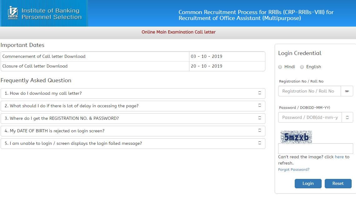 IBPS RRB ऑफिस असिस्टेंट (क्लर्क) Mains Exam 2019 के लिए एडमिट कार्ड इंस्टिट्यूट ऑफ़ बैंकिंग पर्सनेल सिलेक्शन (IBPS) द्वारा जारी कर दिया गया है। एडमिट कार्ड आईबीपीएस की आधिकारिक वेबसाइट ibps.in पर उपलब्ध है। मेन्स परीक्षा 20 अक्टूबर को आयोजित की जाएगी। एडमिट कार्ड अभी डाउनलोड करने के लिए यहां क्लिक करें।