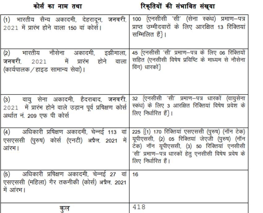 संघ लोक सेवा आयोग (Union Public Service Commission, UPSC) ने संयुक्त रक्षा सेवा परीक्षा सीडीएस (आई), 2020 के लिए आवेदन मांगे हैं। आयोग ने यहां विभिन्न पदों पर कुल 418 रिक्तियां निकाली हैं। जिनके लिए भर्ती प्रक्रिया शुरू हो चुकी है। इच्छुक उम्मीदवार यूपीएससी की वेबसाइट http://www.upsconline.nic.in के माध्यम से 30.10.2019 से 19.11.2019 तक ऑनलाइन आवेदन कर सकते हैं।