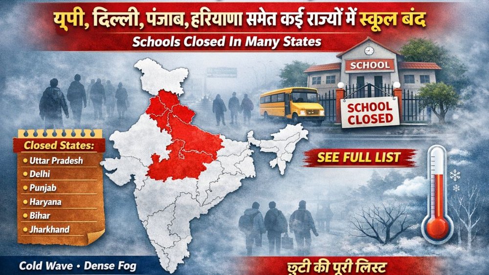 Schools Closed Due to Cold Wave: उत्तर भारत में जारी भीषण ठंड, घना कोहरा और कोल्ड वेव को देखते हुए कई राज्यों के जिला प्रशासन और राज्य सरकारों ने स्कूलों में छुट्टियों की घोषणा कर दी है। छात्रों की सुरक्षा को ध्यान में रखते हुए यह निर्णय लिया गया है। उत्तर प्रदेश, दिल्ली, पंजाब, हरियाणा, बिहार, झारखंड, राजस्थान, मध्य प्रदेश, जम्मू-कश्मीर और तेलंगाना समेत कई राज्यों में अलग-अलग कक्षाओं के लिए स्कूल बंद किए गए हैं।