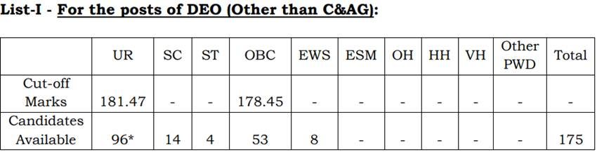 DEO (C & AG के अलावा) के पदों के लिए, 14 एससी, 04 एसटी, 28 ओबीसी और 08 ईडब्ल्यूएस उम्मीदवार यूआर मानक के अनुसार टीयर-2 के लिए क्वालीफाई किया है।
