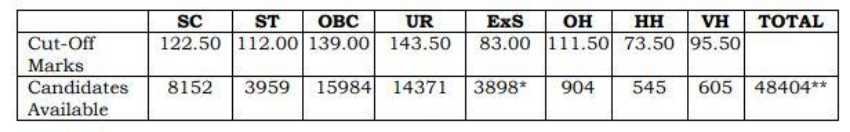 टियर 1 परीक्षा में एससी कैटेगरी की कटऑफ 122.50 है जिसमें 8152 उम्मीदवारों ने क्वालिफाई किया है। एससी की कटऑफ 112.00 है जिसमें 3,959 उम्मीदवारों ने क्वालिफाई किया है। ओबीसी कैटेगरी की कटऑफ 139.00 है जिसमें 15984 ने क्वालिफाई किया है। अनारक्षित कैटेगरी की कटऑफ 143.50 है जिसमें 14,371 कैंडिडेट्स ने क्वालिफाई किया है।