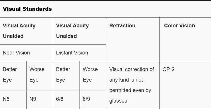 एसएससी जीडी कांस्टेबल भर्ती परीक्षा 2025 का फिजिकल टेस्ट पास करने वाले उम्मीदवार सबसे आखिर में मेडिकल टेस्ट से गुजरेंगे। मेडिकल टेस्ट के दौरान आंखों का विजन चेक किया जाएगा जिसका क्राइटेरिया इस प्रकार है।