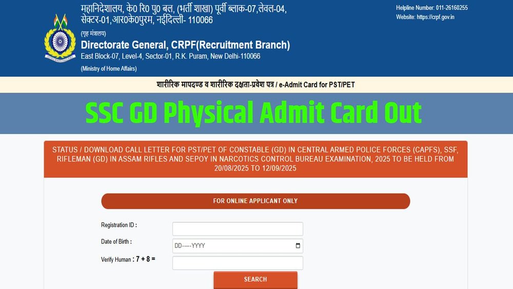कर्मचारी चयन आयोग (SSC) ने मंगलवार (12 अगस्त 2025) को जीडी कांस्टेबल भर्ती 2025 फिजिकल टेस्ट के एडमिट कार्ड जारी कर दिए। 20 अगस्त से शुरू हो रही इस परीक्षा में जो कैंडिडेट शामिल होने वाले हैं वह आयोग की आधिकारिक वेबसाइट ssc.gov.in से प्रवेश पत्र डाउनलोड कर सकते हैं। एडमिट कार्ड डाउनलोड करने के लिए कैंडिडेट्स को अपनी रजिस्ट्रेशन आईडी और जन्मतिथि दर्ज करनी होगी।