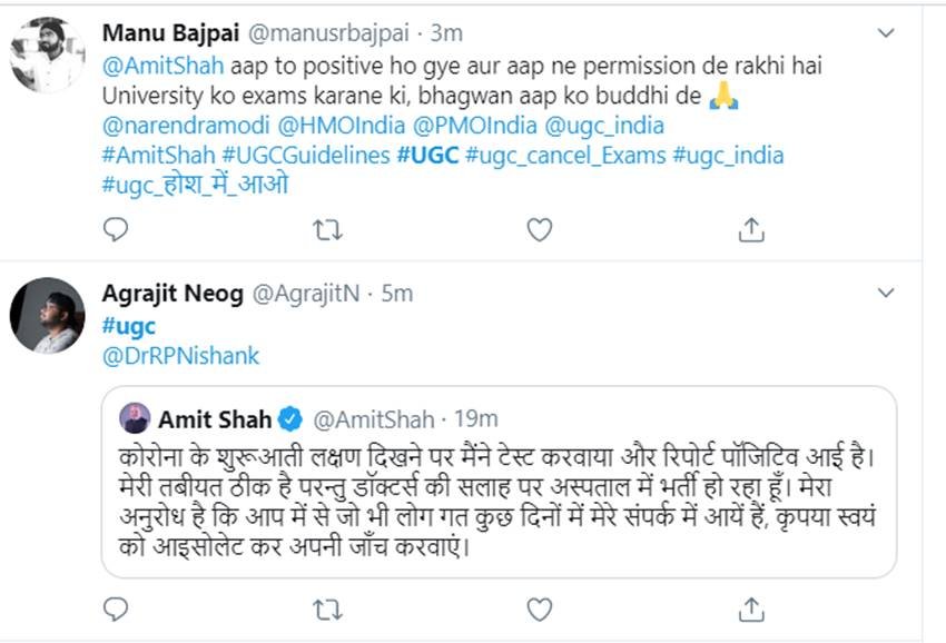 गृहमंत्री अमित शाह भी कोरोनावायरस से संक्रमित हो गए हैं। उन्होंने ट्विट पर खुद इसकी जानकारी देते हुए अपने संपर्क में आए लोगों से खुद को आइसोलेट कर अपनी जांच करवाने की सलाह दी है। अमित शाह ने ट्वीट किया,’ कोरोना के शुरूआती लक्षण दिखने पर मैंने टेस्ट करवाया और रिपोर्ट पॉजिटिव आई है। मेरी तबीयत ठीक है परन्तु डॉक्टर्स की सलाह पर अस्पताल में भर्ती हो रहा हूँ। मेरा अनुरोध है कि आप में से जो भी लोग गत कुछ दिनों में मेरे संपर्क में आयें हैं, कृपया स्वयं को आइसोलेट कर अपनी जाँच करवाएं।’ लेकिन कुछ लोगों ने उनके ट्वीट को UGC और एचआरडी मंत्री रमेश पोखरियाल को टैग करना शुरू कर दिया है। क्योंकि काफी दिनों से कॉलेजो के टर्मिनल और फाइनल सेमेस्टर एग्जाम्स को सितंबर तक आयोजित करने के यूजीसी के निर्देश का विरोध किया जा रहा है।