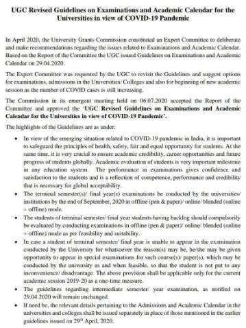 विश्वविद्यालय अनुदान आयोग (यूजीसी) द्वारा विश्वविद्यालयों, महाविद्यालयों, डीम्ड विश्वविद्यालयों, कॉलेजों और अन्य उच्च शिक्षा संस्थानों में विभिन्न पाठ्यक्रमों की अंतिम वर्ष या सेमेस्टर की परीक्षाओं के लिए नए दिशानिर्देश (guidelines) 2020 जारी किए गए हैं जिसके तहत यूनिवसिर्टी और कॉलेजों को फाइनल ईयर के एग्जाम आयोजित करना अनिवार्य कर दिया गया है। हालांकि, यूजीसी की गाइडलाइन्स आने से पहले ही कई यूनिवर्सिटीज ने अपने स्तर पर ही एग्जाम्स को लेकर फैसला ले लिया था वहीं कई यूनिवर्सिटी और कॉलेजों फाइनल ईयर और सेमेस्टर एग्जाम के लिए यूजीसी की गाइडलाइन्स का इंतजार कर रहे थे।