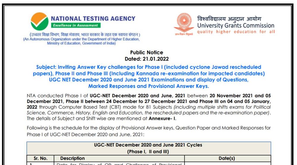 एनटीए द्वारा यह परीक्षा 20 नवंबर 2021 से 5 दिसंबर 2021 तक, फिर 24 दिसंबर से 27 दिसंबर 2021 तक और 4 जनवरी 2022 से 5 जनवरी 2022 तक 81 विषयों के लिए कुल 3 चरणों में आयोजित की गई थी। इस परीक्षा के लिए प्रोविजनल आंसर की चेक करने की सुविधा 21 जनवरी से 24 फरवरी 2022 तक उपलब्ध रहेगी। सभी उम्मीदवार आधिकारिक वेबसाइट पर इन स्टेप्स के माध्यम से आंसर की चेक करके डाउनलोड कर सकते हैं।