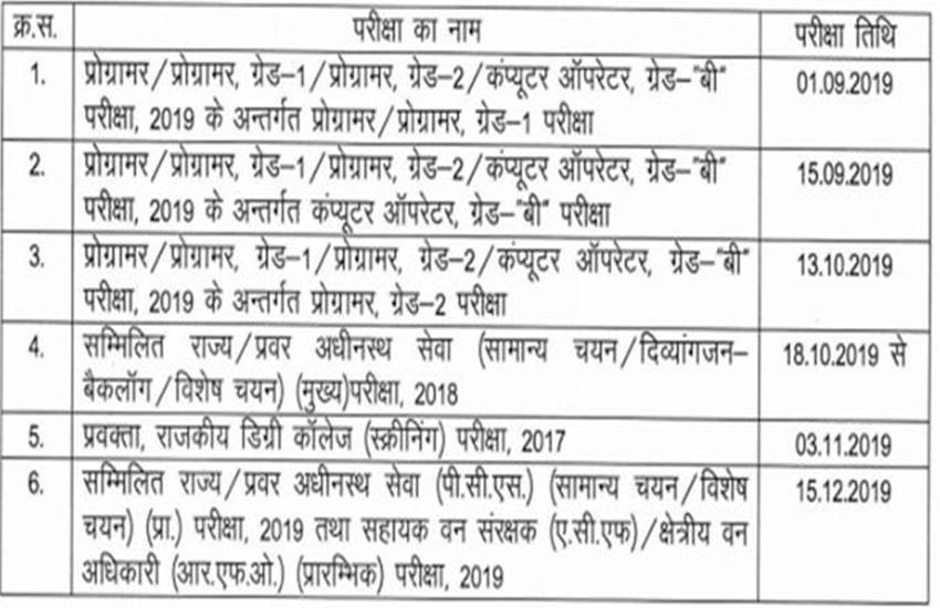 यूपीपीएससी (UPPSC) ने 2019 में आयोजित की जाने वाली परीक्षाओं के लिए भी अधिसूचना जारी की है। यह अधिसूचना उत्तर प्रदेश लोक सेवा आयोग की ऑफिशियल वेबसाइट http://www.uppsc.up.nic.in पर उपलब्ध है। इस अधिसूचना के मुताबिक प्रोग्रामर ग्रेड 1 परीक्षा को रिशेड्यूल किया गया है। ग्रेड 1, ग्रेड बी और ग्रेड 2 की परीक्षा क्रमशः 1 सितंबर, 15 सितंबर और 13 अक्टूबर को आयोजित की जाएगी।