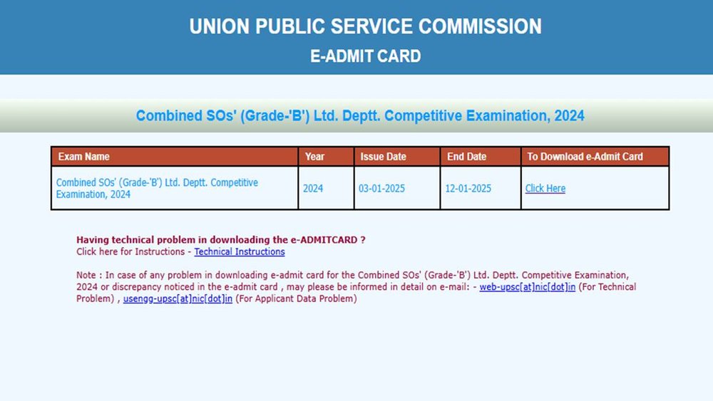 संघ लोक सेवा आयोग (UPSC) ने कंबाइंड सेक्शन ऑफिसर (ग्रेड-B) लिमिटेड विभागीय प्रतियोगी परीक्षा (LDCE) के एडमिट कार्ड जारी कर दिए हैं। जिन उम्मीदवारों ने इस परीक्षा के रजिस्ट्रेशन कराया था वह आयोग की ऑफिशियल वेबसाइट upsconline.gov.in पर जाकर ई एडमिट कार्ड डाउनलोड कर सकते हैं। बता दें कि यह परीक्षा 11 और 12 जनवरी 2025 को आयोजित की जाएगी। अभ्यर्थी 12 तारीख से पहले-पहले प्रवेश पत्र को डाउनलोड कर लें।