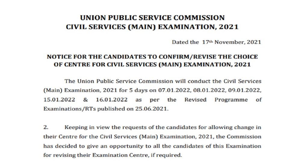 आधिकारिक नोटिस में कहा गया है कि सिविल सेवा (मुख्य) परीक्षा 2021 के लिए अपने केंद्र में परिवर्तन के लिए छात्र-छात्राओं को मौका दिया गया है।