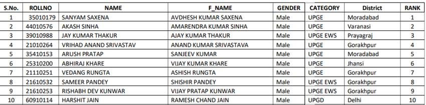 सनम सक्सेना ने 600 में से 560 अंक, 93.34 प्रतिशत हासिल करते हुए रैंक 1 पर कब्जा जमाया। लड़कियों में अनुष्का त्यागी ने सबसे ज्यादा 600 में से 504 अंक और 84.00 प्रतिशत प्राप्त किए। वहीं ओबीसी टॉपर: विनीत कुमार, मार्क्स प्राप्त: 87.33 प्रतिशत (600 में से 524 अंक)। एससी टॉपर: अश्वनी कुमार कमल, मार्क्स प्राप्त: 84.67 प्रतिशत (600 में से 508)। ST टॉपर: अतुल नायक, अंक प्राप्त: 64.67 प्रतिशत (600 में से 388)