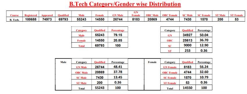 B. Tech- परीक्षा देने वाले उम्मीदवारों की संख्या 74973, पास हुए उम्मीदवारों की संख्या- 69793, पास प्रतिशत: 93.09