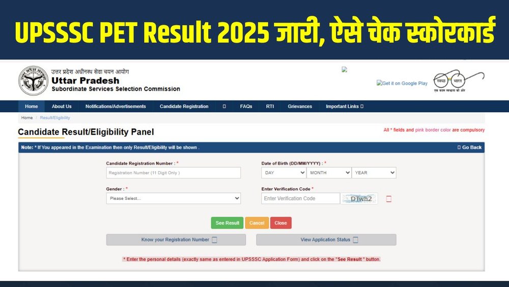 उत्तर प्रदेश अधीनस्थ सेवा चयन आयोग (UPSSSC) ने PET Result 2025 आधिकारिक रूप से जारी कर दिया है। जिन अभ्यर्थियों ने इस परीक्षा में भाग लिया था, वे अब अपना स्कोरकार्ड आयोग की आधिकारिक वेबसाइट upsssc.gov.in पर जाकर देख सकते हैं, जिसकी पूरी प्रक्रिया और डायरेक्ट लिंक यहां दिया गया है। उम्मीदवारों को अपना रिजल्ट चेक करने के लिए रजिस्ट्रेशन नंबर, जन्म तिथि और जेंडर/कैप्चा दर्ज करना होगा।