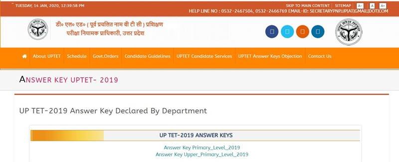 UPTET Answer Key 2019, UPTET Result 2019-2020 Date: Uttar Pradesh Teachers eligibility test, उत्तर प्रदेश टीचर्स एलिजिबिलिटी टेस्ट की आंसर की आज जारी कर दी है। आंसर की आधिकारिक वेबसाइट updeled.gov.in पर जारी की गई है। बोर्ड ने कैंडिडेट्स को प्रोविजनल आंसरी की जारी कर दी है। यूपीटेट का एग्जाम 8 जनवरी 2020 को शिफ्ट में हुआ था। आंसर की जारी होने के बाद कैंडिडे्टस को लगता है कि इसमें किसी करेक्शन की जरूरत है तो वह वैलिड प्रूफ के साथ 17 जनवरी 2020 तक अपनी आपत्ति दर्ज करा सकते हैं। यूपीटेट आंसरी की से जुड़े़ किसी भी नोटिफिकेशन के लिए आधिकारिक वेबसाइट जरूर चेक करें।