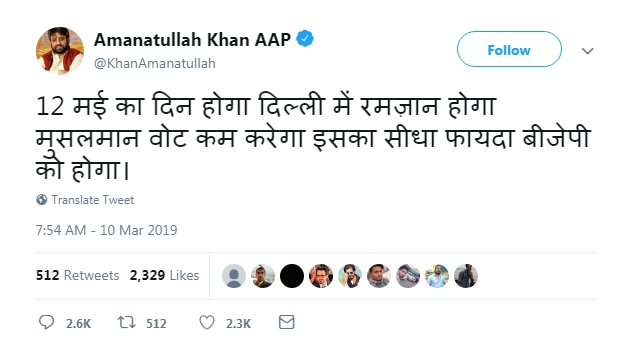 Lok Sabha Election 2019: राष्ट्रीय राजधानी दिल्ली की सभी सात लोकसभा सीटों पर छठे चरण के तहत 12 मई को वोट डाले जाएंगे। अब राजनीतिक दलों के पास मतदाताओं को अपनी ओर आर्किषत करने के लिए करीब दो महीने का समय है। सभी प्रमुख नेताओं ने दिल्ली में छठे चरण में चुनाव कराने का स्वागत किया है। हालांकि दिल्ली में लोकसभा चुनाव की तारीख के ऐलान के बाद आम आदमी पार्टी (AAP) के विधायक अमानतुल्लाह खान सोशल मीडिया यूजर्स के निशाने पर आ गए हैं। उन्होंने चुनाव की तारीख को भाजपा को लाभ पहुंचाने वाला बताया है। विधायक के इस ट्वीट पर सोशल मीडिया यूजर्स खासे भड़क गए और उन्हों खूब ट्रोल किया। दरअसल उन्होंने कहा कि रमजान के महीनों में मतदान होगा तो मुस्लिम समाज वोट डालने के लिए कम बाहर निकलेगा। आप विधायक ने ट्वीट कर कहा, ’12 मई का दिन होगा दिल्ली में रमजान होगा मुसलमान वोट कम करेगा इसका सीधा फायदा बीजेपी को होगा।’