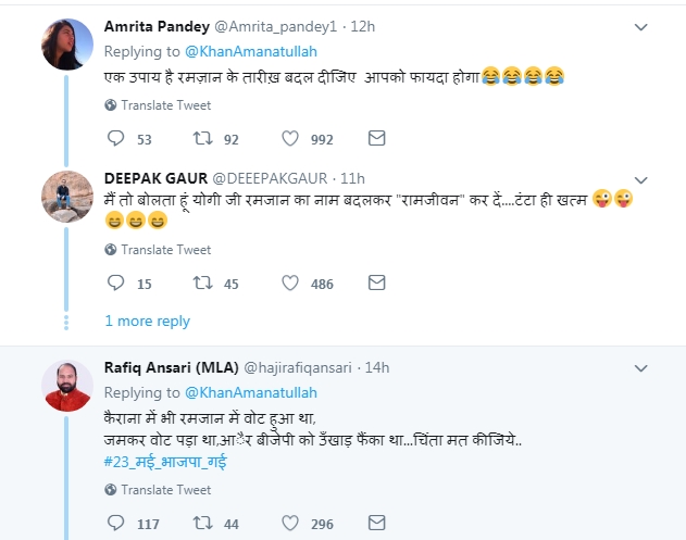 दिल्ली वक्फ बोर्ड के चेयरमैन अमानतुल्लाह खान के इस ट्वीट के कई यूजर्स ने उन्हें खूब लताड़ लगाई। एक यूजर ने ट्वीट कर कहा कि रमजान तो एक महीने चलते हैं, क्या चुनाव रोक दें। अमृता पांडे ने ट्वीट कहा लिखा, ‘एक उपाय है रमजान के तारीख बदल दीजिए आपको फायदा होगा।’ दीपक गौर ने ट्वीट कर लिखा, ‘मैं तो बोलता हूं योगी जी रमजान का नाम बदलकर “रामजीवन” कर दें….टंटा ही खत्म।’ रफी अंसारी लिखते हैं, ‘कैराना में भी रमजान में वोट हुआ था, जमकर वोट पड़ा था, और बीजेपी को उखाड़ फेंका था। चिंता मत कीजीए।’