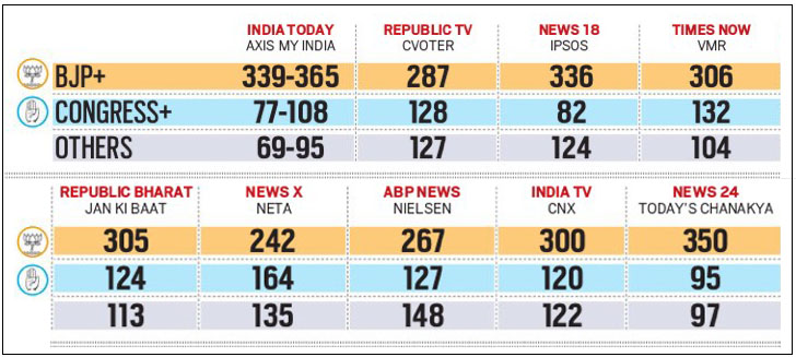 क्या कहते हैं एग्जिट पोल: टाइम्स नाऊ-वीएमआर एग्जिट पोल के मुताबिक एनडीए को कुल 306 सीटें मिल सकती हैं, जबकि यूपीए को 132 और अन्य को 104 सीटें मिलने का अनुमान जताया गया है। C-VOTER के सर्वे में एनडीए को 287, यूपीए को 128 और अन्य को 127 सीटें मिलने का अनुमान जताया गया है। इंडिया टुडे-एक्सिस माई इंडिया के एग्जिट पोल के मुताबिक एनडीए को 339-365, यूपीए गठबंधन को 77-108 और अन्य को 69-95 सीट मिलने के आसार जताए गए हैं। हालांकि, एबीपी न्यूज के एग्जिट पोल में त्रिशंकु लोकसभा के आसार जताए गए हैं। 542 में से 267 सीटें जीतकर एनडीए सबसे आगे रह सकता है, जबकि यूपीए गठबंधन को 127 सीटें मिल सकती हैं। अन्य दलों को 148 सीट मिलने का अनुमान जताया गया है।