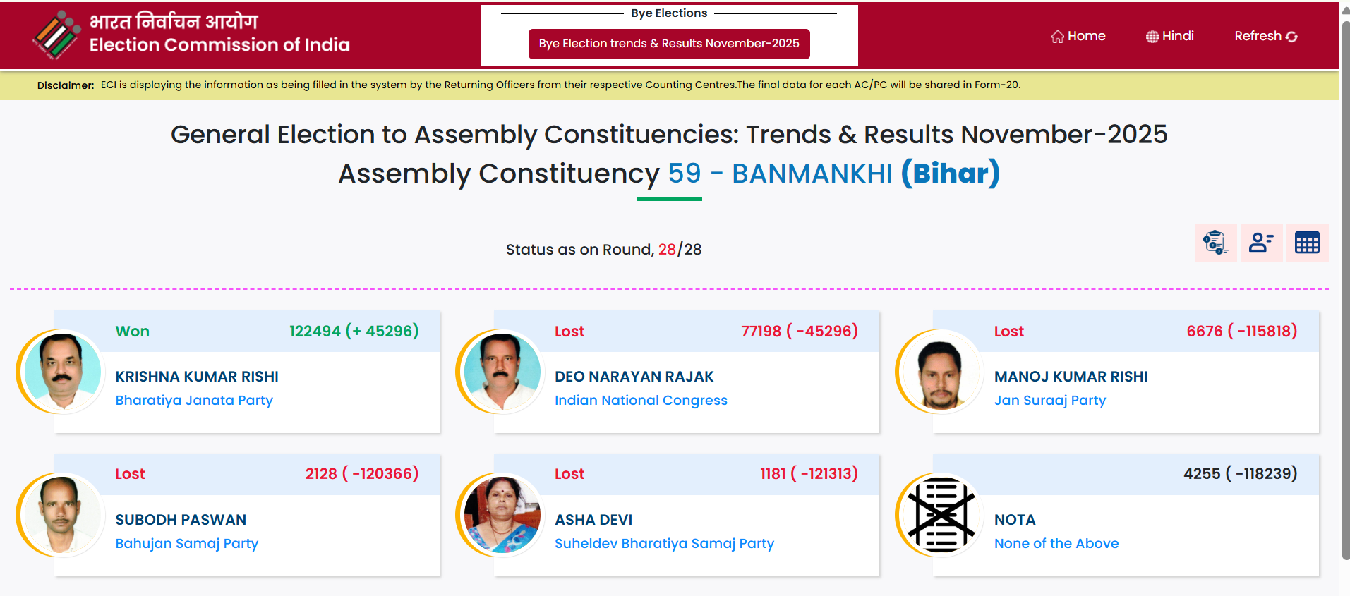 चुनाव आयोग द्वारा जारी आंकड़ों के मुताबिक, कृष्ण कुमार को कुल 122494 वोट मिले हैं, जो कुल वोट का 57.26 प्रतिशत है। वहीं, कांग्रेस प्रत्याशी देव नारायण रजक को 77198 वोट मिले हैं। इस सीट पर जन सुराज पार्टी के मनोज कुमार तीसरे नंबर पर रहे। उन्हें कुल 6676 वोट मिले हैं।
