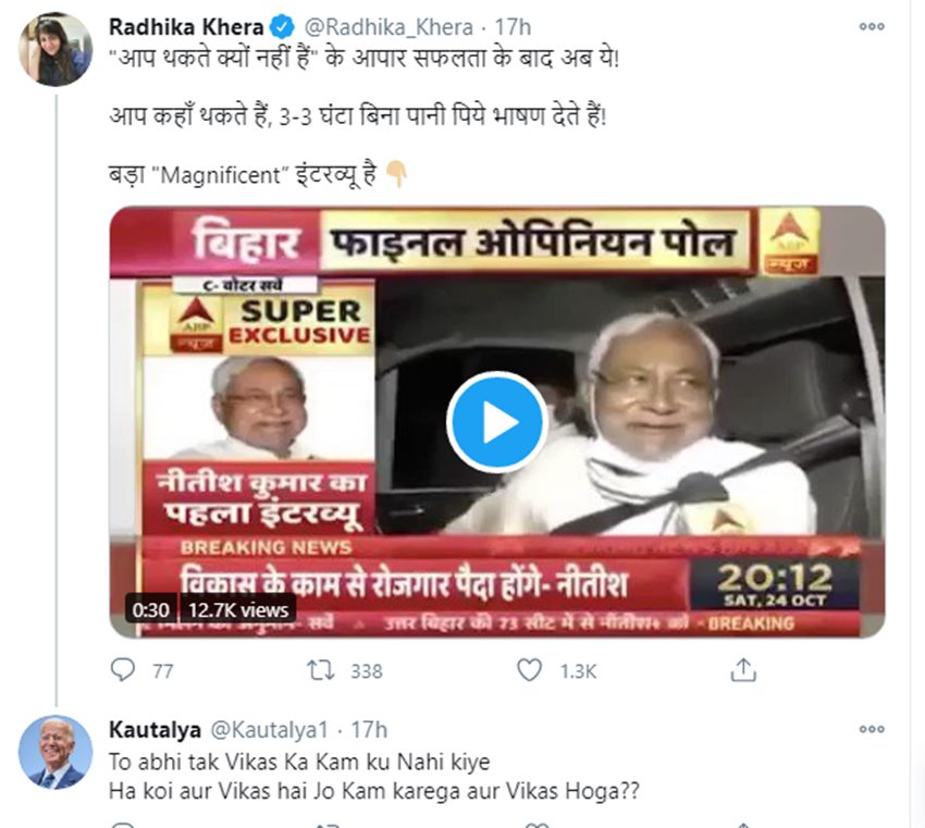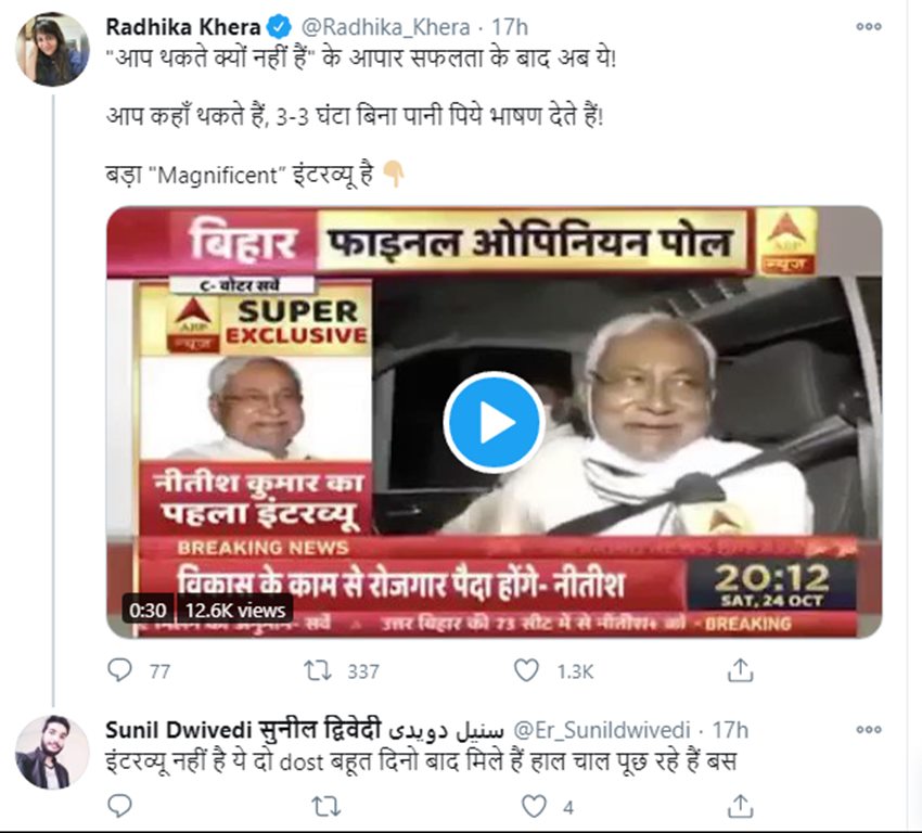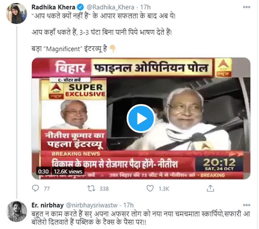 नीतीश की सफाई पर एबीपी न्यूज के रिपोर्टर की टिप्पणी को कांग्रेस की राधिका खेड़ा ने अपने ट्विटर अकाउंट से शेयर किया और तंज भरे अंदाज में लिखा- ”आप थकते क्यों नहीं हैं” की आपार सफलता के बाद अब ये!…आप कहाँ थकते हैं, 3-3 घंटा बिना पानी पिये भाषण देते हैं!…बड़ा “Magnificent” इंटरव्यू है।’