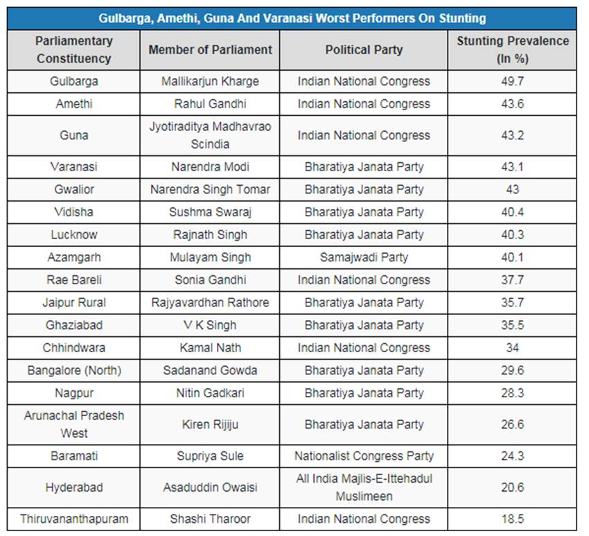 ‘स्टेट ऑफ न्यूट्रीशियन अमंग चिल्ड्रेन इन पार्लियामेंट्री कॉन्सिटटुएंसीज़ ऑफ इंडिया’ के मुताबिक, सबसे बदतर हालत खड़गे के गुलबर्ग (कर्नाटक) क्षेत्र की है, जहां कुपोषण की दर 49.7 फीसदी है। दूसरे नंबर पर राहुल का अमेठी (यूपी) है, जहां 43.6 प्रतिशत कुपोषण है, जबकि तीसरे नंबर पर कांग्रेसी नेता ज्योतिरादित्य सिंधिया के गुणा (मध्य प्रदेश) का नाम है। वहां यह आंकड़ा 43.2 फीसदी पाया गया।