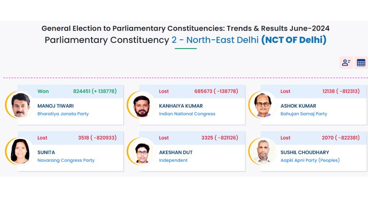 लेटेस्ट रिपोर्ट्स के मुताबिक, नॉर्थ-ईस्ट दिल्ली से मौजूदा बीजेपी सांसद मनोज तिवारी ने इंडिया गठबंधन के कन्हैया कुमार को 3 लाख वोटों के बड़े मार्जन से हरा दिया है। हालांकि, अभी चुनाव आयोग की तरफ से औपचारिक ऐलान होना बाकी है।
