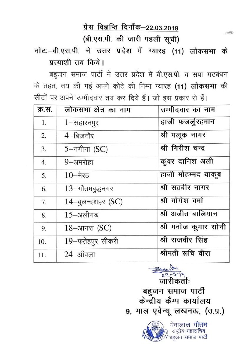 लोकसभा चुनाव को ध्यान में रखते हुए मायावती के नेतृत्व वाली बहुजन समाज पार्टी (बसपा) ने उम्मीदवारों की पहली सूची जारी कर दी है। शुक्रवार (22 मार्च, 2019) को आई इस लिस्ट में 11 उम्मीदवारों के नाम हैं। नीचे देखें पूरी लिस्ट। वहीं, अखिलेश यादव के नेतृत्व वाली समाजवादी पार्टी ने गाजियाबाद सीट से प्रत्याशी को बदल दिया। सुरेंद्र कुमार मुन्नी के बजाय अब चुनाव सुरेश बंसल लड़ेंगे।