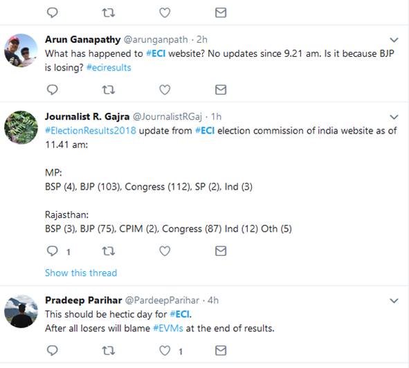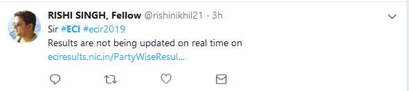 दरअसल सुबह 11 बजे के करीब चुनाव आयोग की वेबसाइट अपडेट होनी बंद हो गई थी। ऐसा तब होता है जब वेबसाइट पर ज्यादा लोड हो जाता है या फिर कोई दूसरी तकनीकी खामी आ जाती है। चुनाव आयोग की वेबसाइट पर वैसे भी अपडेट अपेक्षाकृत देर से होता है। इसे लेकर भी कई ट्विटर यूजर्स ने निशान साधा।