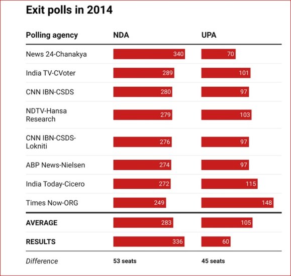 2014 में औसतन आठ एग्जिट पोल ने अनुमान लगाया था कि बीजेपी के नेतृत्व वाले एनडीए को 283 सीटें और कांग्रेस के नेतृत्व वाले यूपीए को 105 सीटें मिलेंगी – उस साल ‘मोदी लहर’ की सीमा का अनुमान लगाने में विफल रहे, जिसमें एनडीए को 336 सीटें और यूपीए को मात्र 60 सीटें मिलीं। इनमें से बीजेपी ने 282 और कांग्रेस ने 44 सीटें जीतीं।