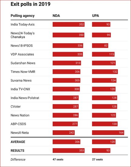 2019 में औसतन 13 एग्जिट पोल ने एनडीए की संयुक्त संख्या 306 और यूपीए की 120 बताई – फिर से एनडीए के प्रदर्शन को कम करके आंका, जिसने कुल 353 सीटें जीतीं। यूपीए को 93 सीटें मिलीं। इनमें से बीजेपी ने 303 और कांग्रेस ने 52 सीटें जीतीं।
