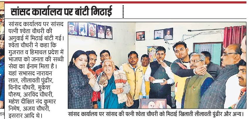 स्थानीय अखबारों में छपी खबर के अनुसार, वसुंधरा एंक्लेव स्थित सांसद कार्यालय में भाजपा सांसद के अलावा उनकी पत्नी श्वेता चौधरी व कई नेता मौजूद रहे। श्वेता चौधरी ने समारोह में मिठाई भी बंटवाई। उन्होंने कहा कि ‘गुजरात व हिमाचल प्रदेश में भाजपा को जनता की सच्ची सेवा का इनाम मिला है।’