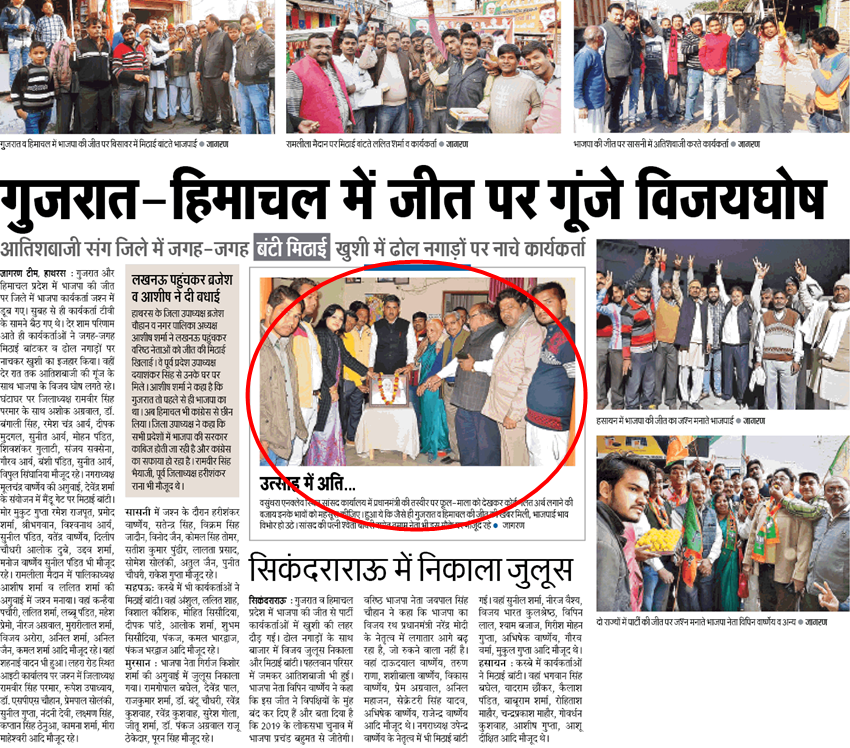 गुजरात विधानसभा चुनाव में भारतीय जनता पार्टी (भाजपा) ने लगातार छठी बार जीत हासिल की। 182 विधानसभा सीटों के लिए हुए विधानसभा चुनाव में भाजपा ने कुल 99 सीटों पर जीत दर्ज की। वहीं कांग्रेस गठबंधन को 80 सीटों पर कामयाबी मिली, यानी सत्तारूढ़ पार्टी से सिर्फ 19 सीटें कम। वहीं, हिमाचल प्रदेश के 68 विधानसभा सीटों के लिए हुए चुनाव में 44 विधानसभा सीटों पर सफलता प्राप्त करते हुए सत्ता की बागडोर भारतीय जनता पार्टी (भाजपा) की हाथों में आ गई है, वहीं कांग्रेस को 21 सीटें पर विजय मिलीं। देश भर में भाजपा कार्यकर्ताओं ने ढोल-नगाड़े, पटाखों और मिठाइयों के साथ जीत का जश्न मनाया, मगर हिमाचल में एक कदम आगे निकल गए। हाथरस से भाजपा सांसद राजेश दिवाकर के कार्यालय में कई कार्यकर्ता व नेता जुटे। यहां लोगों ने एक-दूसरे को मिठाई खिलाई और प्रधानमंत्री नरेंद्र मोदी की तस्वीर पर माला चढ़ा कर हिमाचल और गुजरात की जीत का जश्न मनाया। तस्वीर पर माला पुण्यतिथि के अवसर पर चढ़ाई जाती है।