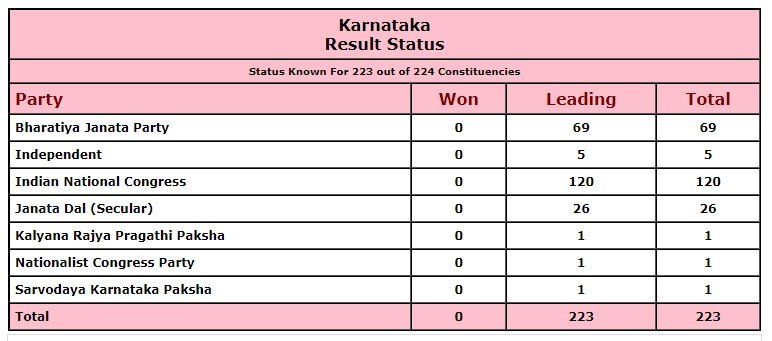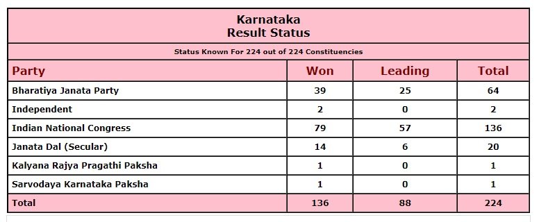 Karnataka Election Results Live: कर्नाटक में कांग्रेस पार्टी ने बड़ी जीत दर्ज की है। चुनाव आयोग के आंकड़ों के अनुसार, कांग्रेस अब तक 79 सीटों पर जीत दर्ज कर चुकी है। इस समय कांग्रेस 57 सीटों पर बढ़त बनाए हुए है। दूसरी तरफ बीजेपी ने 39 सीटें जीती हैं जबकि वह 25 सीटों पर आगे चल रही है। जेडीएस ने 14 सीटों पर जीत दर्ज की है। 6 पर उसने बढ़त बनाई हुई है।
