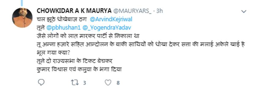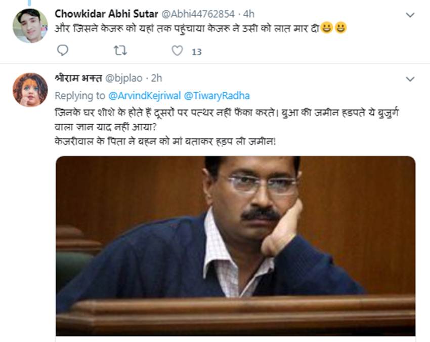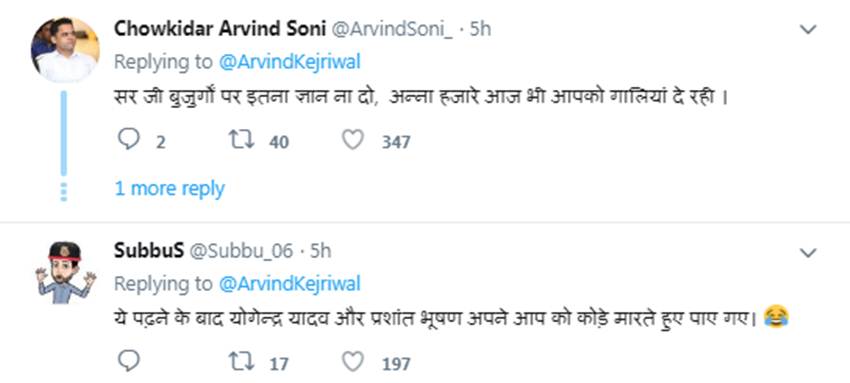 सीएम की इसी टिप्पणी को लेकर टि्वटर यूजर्स ने उन्हें निशाने पर ले लिया। लोगों ने समाजसेवी अन्ना हजारे का जिक्र छेड़ा और पूछा कि आपने भी तो इंडिया अगेंस्ट करप्शन (आईएसी) आंदोलन हाईजैक कर लिया था। आपने भी तो पिता समान अन्ना के पीठ में ‘छुरा’ भोंका और सत्ता की मलाई अकेले खा ली। अपने नाम के आगे चौकीदार लगाने वाले अरविंद सोनी के टि्वटर हैंडल से कहा गया कि सर, बुजुर्गों पर अधिक ज्ञान न दें। अन्ना आज भी आपको गालियां दे रहे हैं।