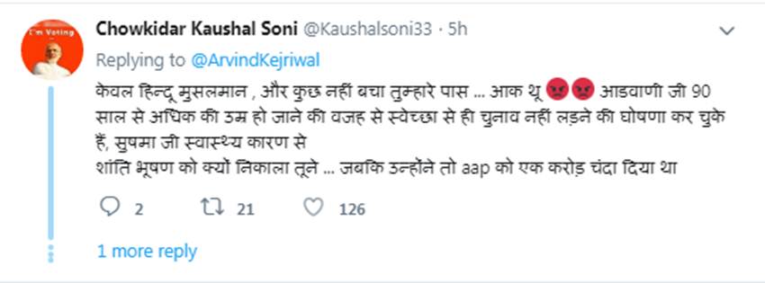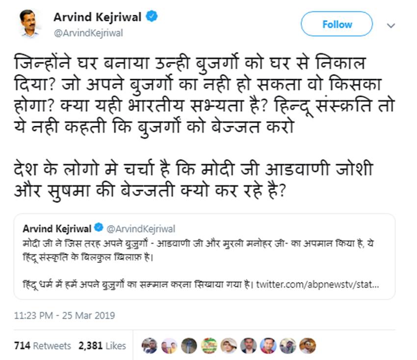 दरअसल, केजरीवाल का हालिया ट्वीट बीजेपी के उस फैसले पर आया, जिसमें गांधीनगर (गुजरात) से दिग्गज नेता लाल कृष्ण आडवाणी को टिकट के बजाय पार्टी चीफ अमित शाह को टिकट दे दिया। वहीं, दल के एक अन्य दिग्गज नेता मुरली मनोहर जोशी ने भी मतदाताओं के नाम पत्र लिख स्पष्ट किया कि पार्टी ने उन्हें चुनाव न लड़ने की सलाह दी है।