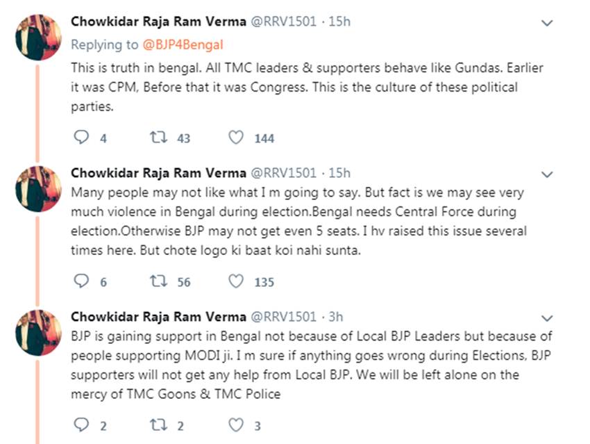 इस वीडियो ट्वीट पर प्रतिक्रिया देते हुए यूजर ‘चौकीदार राजा राम वर्मा’ ने लिखा, “यह बंगाल की सच्चाई है। सभी टीएमसी नेता और समर्थक गुंडे की तरह व्यवहार करते हैं। पहल यह काम सीपीएम करती थी और उससे पहले कांग्रेस। यह इन राजनीतिक पार्टियों का चरित्र है। अब मैं जो कुछ कहने जा रहा हूं, कई लोग उसे पसंद नहीं करेंगे। लेकिन सच्चाई यह है कि बंगाल में चुनाव के दौरान हमने काफी हिंसा देखी है। चुनाव के दौरान बंगाल में केंद्रीय बलों की तैनाती होनी चाहिए अन्यथा भाजपा 5 सीट भी नहीं जीत सकती है। मैं यह मुद्दा यहां कई बार उठाया है लेकिन छोटे लोगों की बात कोई नहीं सुनता है। बंगाल में भाजपा का जनाधार स्थानीय नेताओं की वजह से नहीं बल्कि मोदी जी की वजह से बढ़ रहा है। मुझे विश्वास है कि यदि चुनाव के दौरान कुछ भी गलत होता है, भाजपा समर्थकों को स्थानीय नेताओं से किसी तरह की मदद नहीं मिलेगी। हमें टीएमसी के गुंडों और टीएमसी पुलिस के रहमोकरम पर छोड़ दिया जाएगा।”