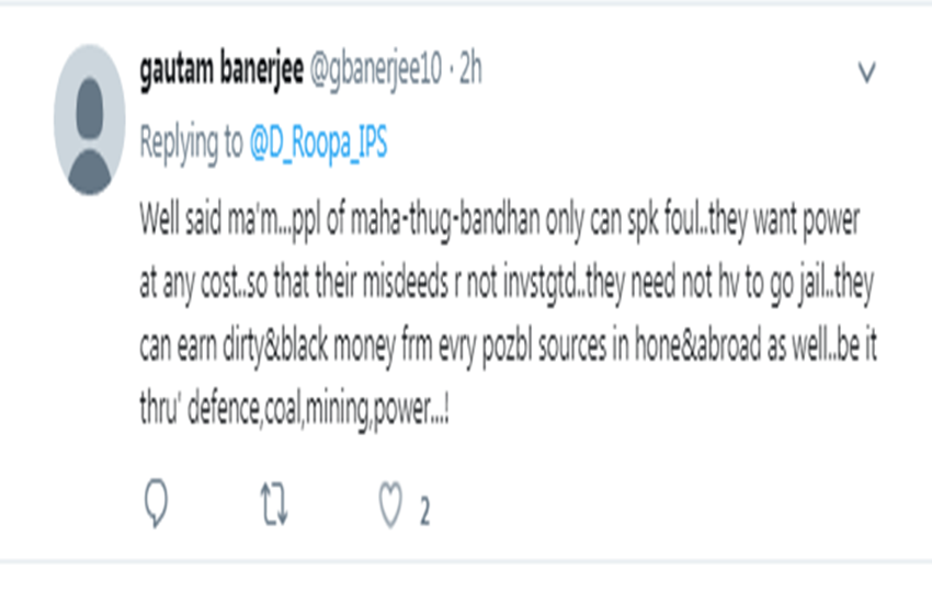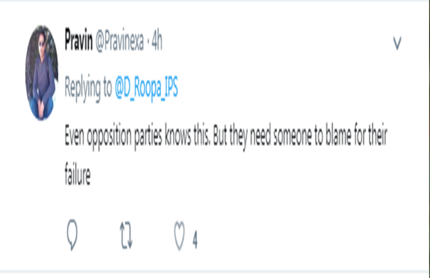 बता दें कि डी रूपा कर्नाटक की तेजतर्रार आइपीएस अफसरों में शुमार हैं। फील्ड ही नहीं सोशल मीडिया पर भी सक्रियता के लिए जानी जातीं हैं। वह जरूरी सम-सामयिक मुद्दों पर ट्वीट और पोस्ट लिखतीं रहतीं हैं। और ट्वीटर पर 1 लाख 26 हजार फॉलोअर्स भी हैं।