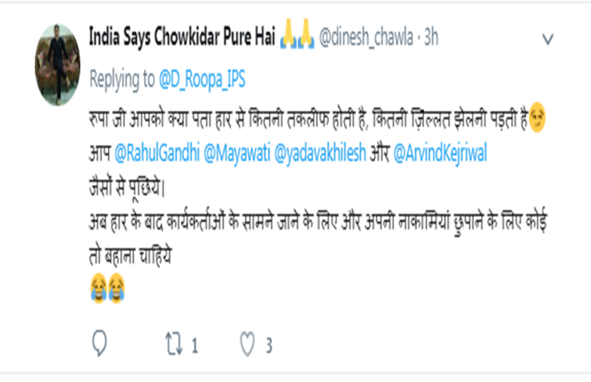 एक यूजर लिखते हैं ‘रूपा जी आपको क्या पता हार से कितनी तकलीफ होती है, कितनी जिल्लत झेलनी पड़ती है, आप राहुल गांधी, मायावती, अखिलेश यादव और अरविंद केजरीवाल जैसे नेताओं से पूछिए। अब हार के बाद कार्यकर्ताओं के सामने जाने के लिए और अपनी नाकामियां छुपाने के लिए कोई तो बहाना चाहिए।