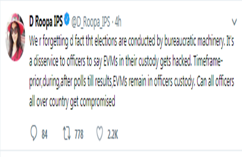 डी. रूपा ने ट्वीट किया ‘हम इस बात को भूल रहे हैं कि चुनाव नौकरशाही मशीनरी द्वारा आयोजित किए जाते हैं। अधिकारियों की देखरेख में ईवीएम को हैक करने की बात कहना गलत है। चुनाव से पहले, चुनाव परिणाम के दौरान, चुनावों के बाद, ईवीएम अधिकारियों की हिरासत में ही रहती हैं। क्या देश के सभी अधिकारी इसके लिए समझौता कर सकते हैं।’