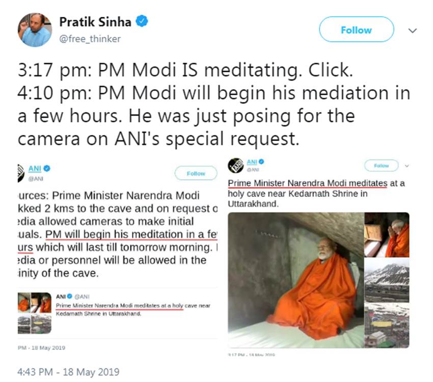 Lok Sabha Election 2019: प्रधानमंत्री नरेंद्र मोदी शनिवार को उत्तराखंड के गढ़वाल हिमालयी क्षेत्र में स्थित 12 ज्योतिर्लिंगों में से एक विश्वप्रसिद्ध बाबा केदारनाथ के दर्शन किये और निकटवर्ती पहाडी की एक गुफा में ध्यान साधना की। गुफा में ध्यानमग्न होने से पहले पीएम ने मीडिया को पोज दिया। फोटो खिंचवाते वक्त आंख खोलकर देखने लगे। इसके बाद सोशल मीडिया पर यूजर्स उन्हें ट्रोल कर रहे हैं। प्रतीक सिन्हा ने लिखा, ” 3 बजकर 17 मिनट पर एएनआई ने ट्वीट किया कि पीएम ध्यानमग्न हैं। 4 बजकर 10 मिनट पर ट्वीट किया कि पीएम मोदी कुछ घंटे में ध्यानमग्न होंगे। एएनआई के विशेष आग्रह पर वे कैमरे के लिए पोज दे रहे थे।”