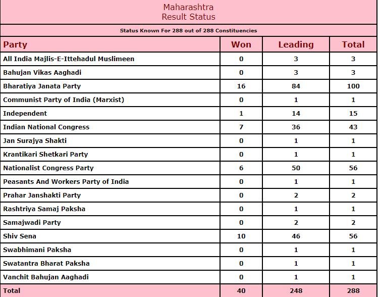Haryana, Maharashtra Vidhan Sabha Election/Chunav Result 2019: महाराष्ट्र व हरियाणा विस चुनाव के नतीजे गुरुवार को आ चुके हैं। चुनाव आयोग (EC) के आंकड़ों के अनुसार, महाराष्ट्र में बीजेपी को 105, शिवसेना को 56, NCP को 54, INC को 44 और MNS को 1 सीट हासिल हुई।