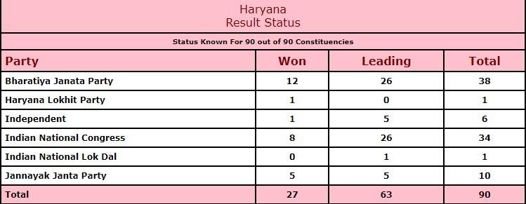 हिंदी न्यूज चैनल एबीपी के रुझान के मुताबिक हरियाणा में कांग्रेस ने 35 सीटों पर बढ़त बना ली है जबकि भाजपा भी 35 सीटों पर आगे हैं। इसी बीच दुष्यंत कुमार चौटाला की जेजेएम ने भी 10 सीटों पर बढ़त बना ली है। दस निर्दलीय उम्मीदवार भी आगे चल रहे हैं। महाराष्ट्र के रुझानों की बात करें तो भाजपा अभी 102 सीटों पर आगे है जबकि शिवसेना ने 61 सीटों पर बढ़त बनाई है। कांग्रेस 41 सीटों पर आगे हैं और एनसीपी ने 54 सीटों पर बढ़त बरकरार रखी है। 30 निर्दलीय उम्मीदवार भी आगे चल रहे हैं।