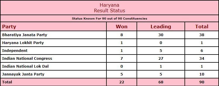 न्यूज चैनल एबीपी के शुरुआती आंकड़ों के मुताबिक हरियाणा में भाजपा को इस बार स्पष्ट बहुमत मिलने की उम्मीद नहीं हैं और कांग्रेस कड़ी टक्कर देती हुई नजर आ रही है। चैनल के मुताबिक भाजपा 41 सीटों पर आगे है जबकि कांग्रेस ने 35 सीटों पर बढ़त बना ली है। जननायक जनता पार्टी ने 7 सीटों पर बढ़त बनाई है जबकि 9 सीटों पर निदर्लीय उम्मीदवार आगे हैं। न्यूज चैनल आजतक की रिपोर्ट के मुताबिक निर्दलीयों में पूर्व सीएम और कांग्रेस नेता भूपेंद्र सिंह हुड्डा के समर्थकों की तादाद खासी अच्छे हैं। सूत्रों के मुताबिक हुड्डा कई नेताओं को कांग्रेस टिकट दिलाना चाहते हैं मगर टिकट ना मिलने की सूरत में उन्होंने निर्दलीय चुनाव लड़ा।