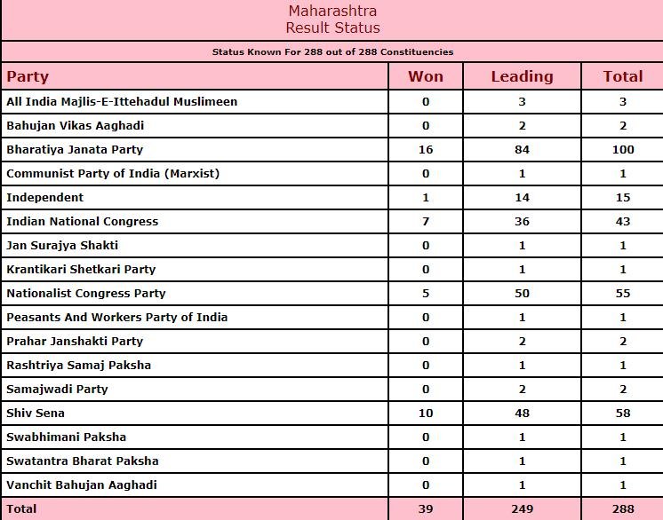 चुनाव आयोग की वेबसाइट के मुताबिक महाराष्ट्र में भाजपा ने 21 सीटों पर बढ़त बना ली है जबकि एनसीपी 15 सीटों पर आगे चल रही है। इसी तरह शिवसेना 13 सीटों पर आगे हैं और कांग्रेस उम्मीदवार पांच सीटों पर आगे चल रहे हैं। चार सीटों पर निर्दलीय उम्मीदवार भी आगे चल रहे हैं। हरियाणा रुझान की बात करें तो प्रदेश में भाजपा 8 सीटों पर आगे है और कांग्रेस ने महज दो सीटों पर बढ़त बनाई है। जननायक जनता पार्टी के 2 दो उम्मीदवारों ने चुनाव में बढ़त बनाई है।
