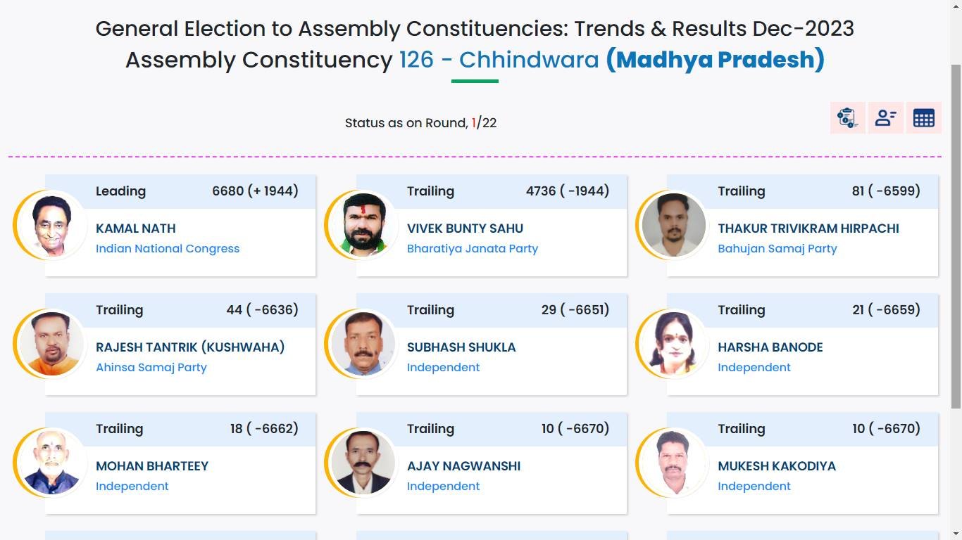 मध्य प्रदेश कांग्रेस अध्यक्ष कमलनाथ ने छिंदवाड़ा सीट पर अपने नजदीकी प्रतिद्वंद्वी भाजपा के विवेक बंटी साहू से करीब 2000 वोटों से आगे चल रहे हैं। पहले वह पीछे चल रहे थे। इस सीट से 22 लोग चुनाव मैदान में उतरे हैं। तीसरे नंबर पर बहुजन समाज पार्टी के ठाकुर त्रिविक्रम हिरपाची हैं। हालांकि, उन्हें अब तक 81 वोट ही मिले हैं।