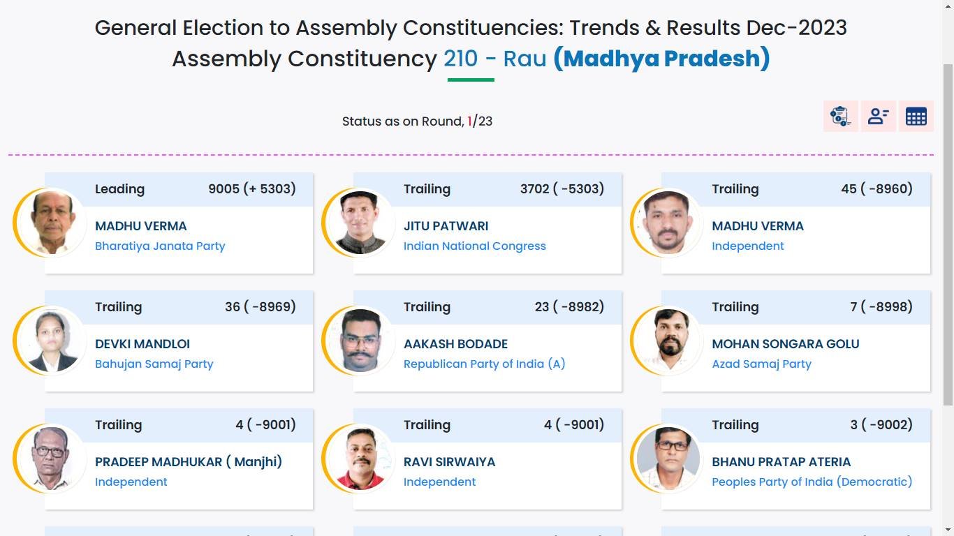 मध्य प्रदेश की राऊ विधानसभा सीट से भाजपा के लिए अच्छी खबर है। यहां भाजपा के मधु वर्मा कांग्रेस के कद्दावर युवा नेता जीतू पटवारी से करीब 5000 वोटों से आगे चल रहे हैं।