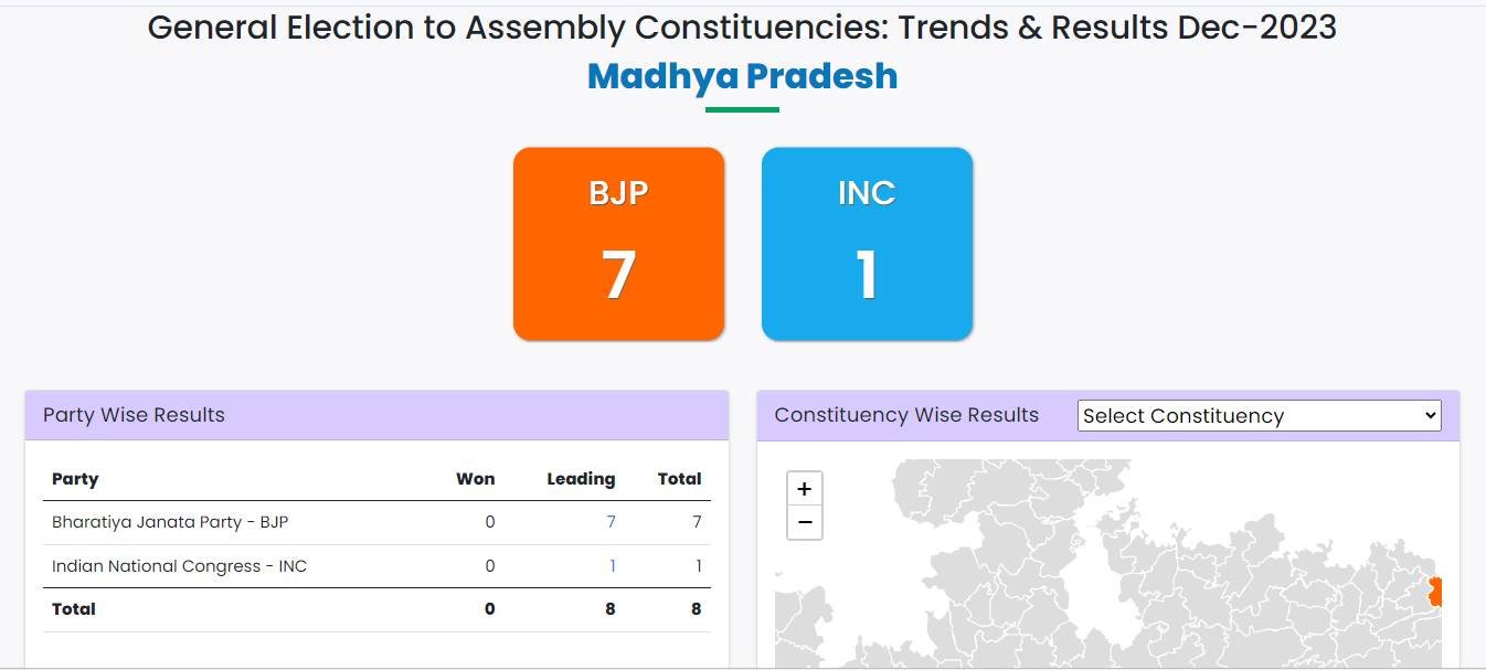 चुनाव आयोग की वेबसाइट में अब तक 8 सीटों पर रुझान जारी किए गए हैं। इनमें से 7 सीटों पर भाजपा और एक में कांग्रेस आगे है। हालांकि, ये अभी शुरुआती रुझान हैं। आगे तस्वीर बदल सकती है। छत्तीसगढ़ के चुनावी अपडेट्स जानने के लिए यहां क्लिक करें।