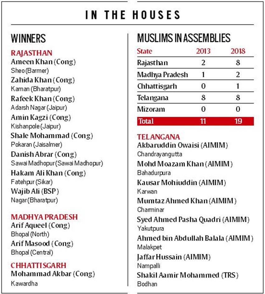 तेलंगानाः तेलंगाना में सबसे ज्यादा 26 मुस्लिम उम्मीदवार चुनाव मैदान में थे। इनमें से 8 उम्मीदवार एआईएमआईएम ने, 9 कांग्रेस ने, 8 टीआरएस ने और एक तेदेपा के थे। एआईएमआईएम के 8 में से 7 उम्मीदवार जीते, टीआरएस के एक ही मुस्लिम उम्मीदवार को जीत मिली। कांग्रेस के सभी मुस्लिम उम्मीदवार चुनाव हार गए। मिजोरम में कोई भी मुस्लिम उम्मीदवार जीत नहीं दर्ज कर सका।