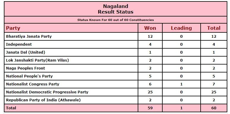 चुनाव आयोग के मुताबिक, भारतीय जनता पार्टी ने एक सीट जीत ली है। वहीं, रुझानों में एनडीपीपी-बीजेपी गठबंधन को बहुमत मिला है। गठबंधन 40 सीटों पर आगे चल रहा है, जबकि एनपीएफ 4 सीटों पर और कांग्रेस 1 सीट पर बढ़त बनाए हुए है।