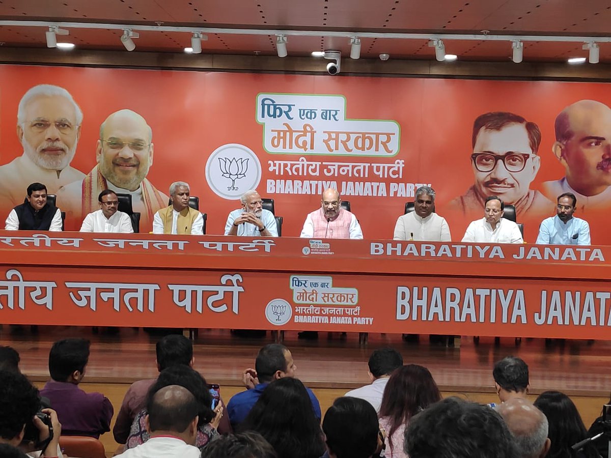 5 सालों में पहली बार प्रेस कॉन्फ्रेस में पहुंचे पीएम मोदी। पीएम मोदी के संबोधन के पहले बीजेपी अध्य़क्ष अमित शाह ने कहा- 'मोदी सरकार की 133 योजनाओं ने देश को आगे बढ़ाने का काम किया। ये चुनाव आजादी के बाद के चुनाव में भाजपा की दृष्टि से सबसे ज्यादा मेहनत करने वाला, सबसे विस्तृत चुनाव अभियान रहा है। इस चुनाव में हमारा अनुभव के अनुसार जनता हमसे आगे आगे रही है। मोदी सरकार फिर से बनाने के लिए जनता का उत्साह भाजपा से आगे रहा है।'